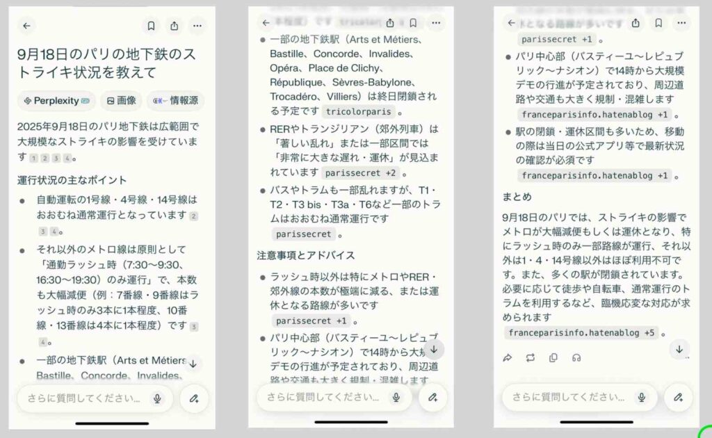 Perplexityに「9月18日のパリの地下鉄のストライキ状況を教えて」と尋ねてみたところ、期待をはるかに上回る回答が返ってきました。その回答は、まるで現地の最新ニュース速報を読んでいるかのようでした。