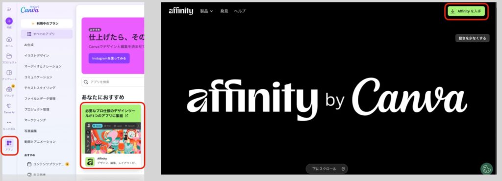 - Canvaの公式ページにアクセスしてアプリからAffinityを選択
