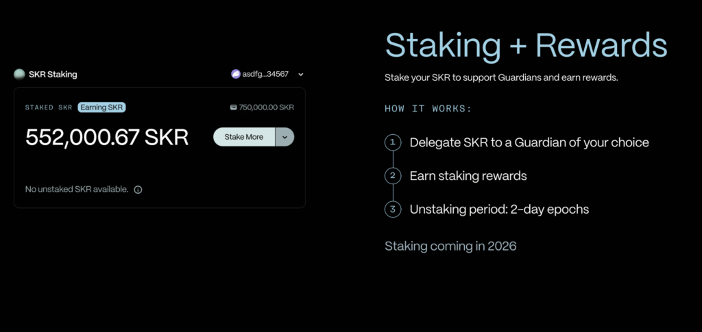 2026年1月にSKRが正式ローンチされると同時に、ステーキング機能もスタートします。 手に入れたSKRを「ガーディアン(Guardians)」と呼ばれる運営者にデリゲート(委任)することで、ネットワークのセキュリティに貢献し、その対価として報酬を得ることができます