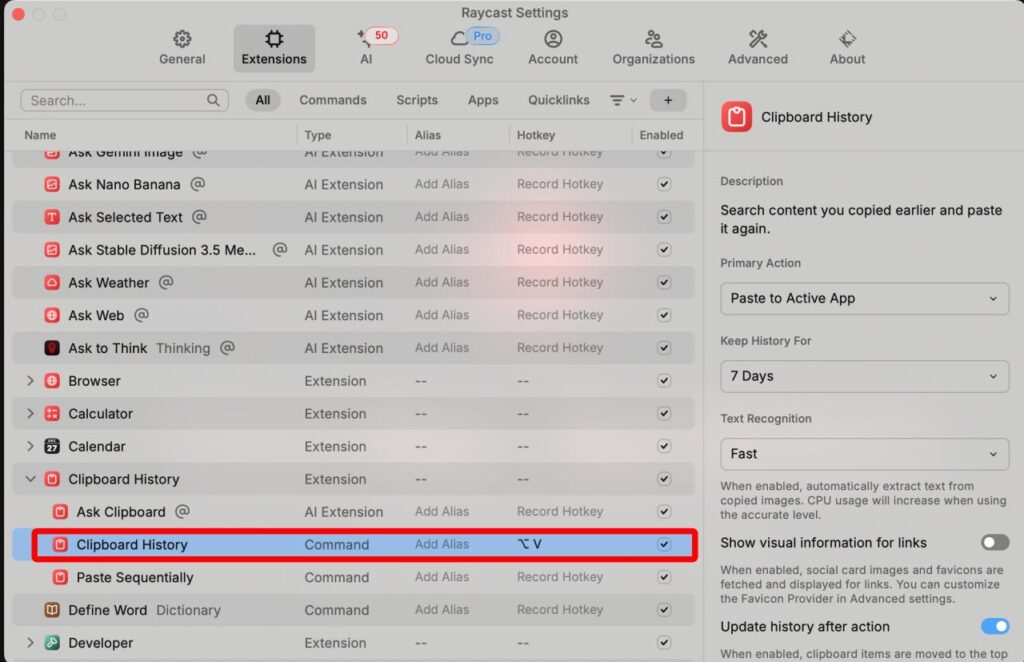 Extensions > Clipboard History にショートカット(例:Option + V)を割り当てます。これで過去30日間のコピー履歴が利用可能になります。 割り当て方は、画面のように、Cli@bpad Historyを開いて、右のRecord Hotkeyを押して、Option+Vキーを押すとHotkeyが割り当てられます。