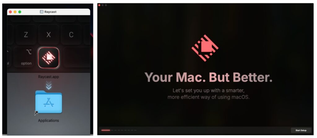 - ダウンロードされた .dmg ファイルを開き、Raycastのアイコンを「Applications」フォルダにドラッグします。