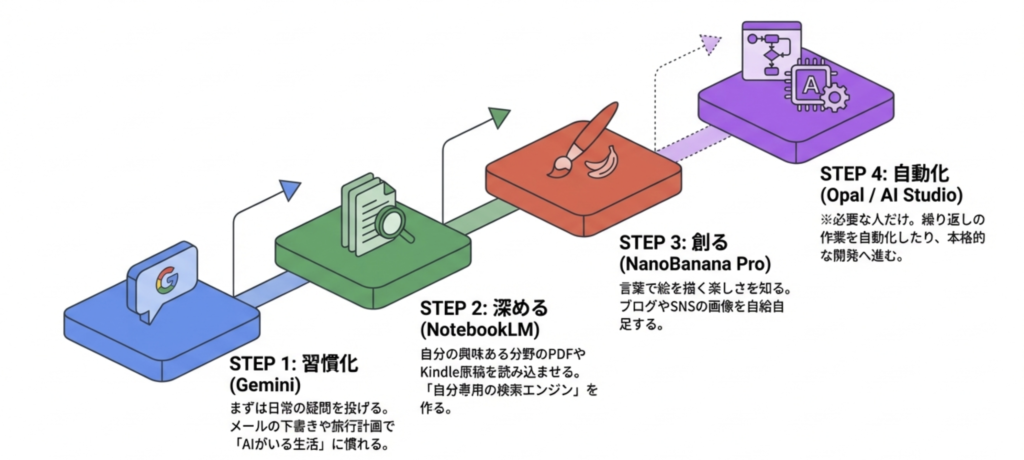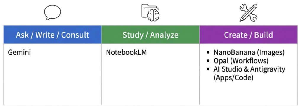 Google系AIのコツは、名前を覚えるよりも、役割を覚えることです。