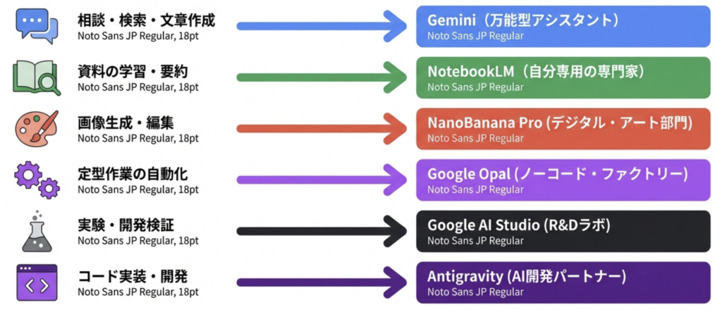 まずは全体像:6つのGoogle系AIを「役割」で見る