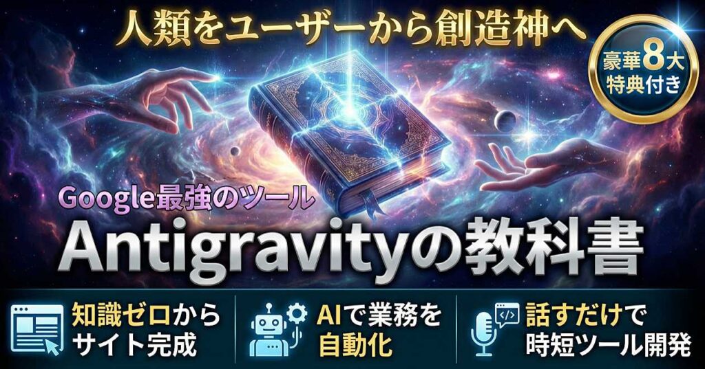 より深くAntigravityを学習して活用したい方へ:こちらの教材は、百科事典のようなボリューム満点の内容です。 Antigravityをこれから始めてみたい人向けに 懇切丁寧な解説と動画教材付きで。 めっちゃおすすめです。