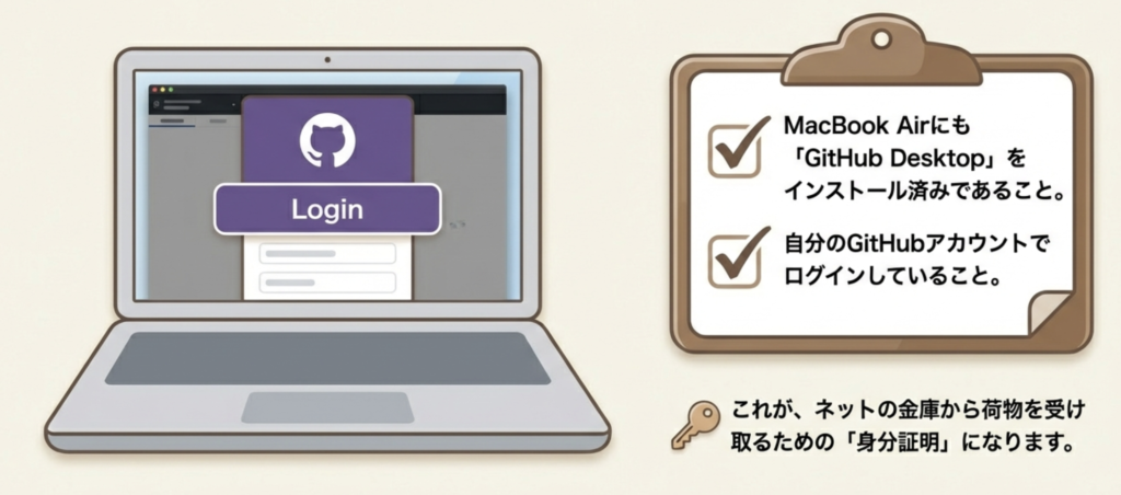 そのためのGitHub(ギットハブ)ですよ!前回、iMacのデータを『ネットの金庫』に預けましたよね?今日はその金庫から、MacBook