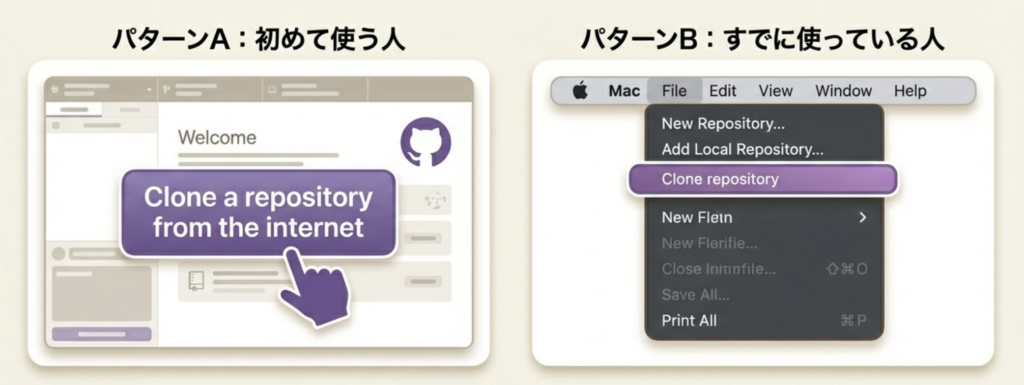 ※もし画面が違う場合は、メニューバーの「File」→「Clone Repository…」を選べばOKです。