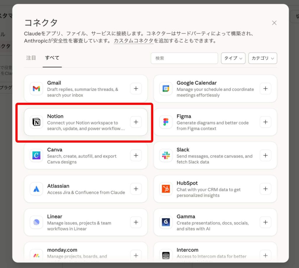 「コネクタを参照」を押すと、利用可能なサービス一覧が表示されます。Gmail、Google Calendar、Notion、Figma、Canva、Slack、Atlassian、HubSpot、Linearなど、主要なツールが揃っています。追加したいサービスの「+」ボタンを押すだけで連携が始まります。