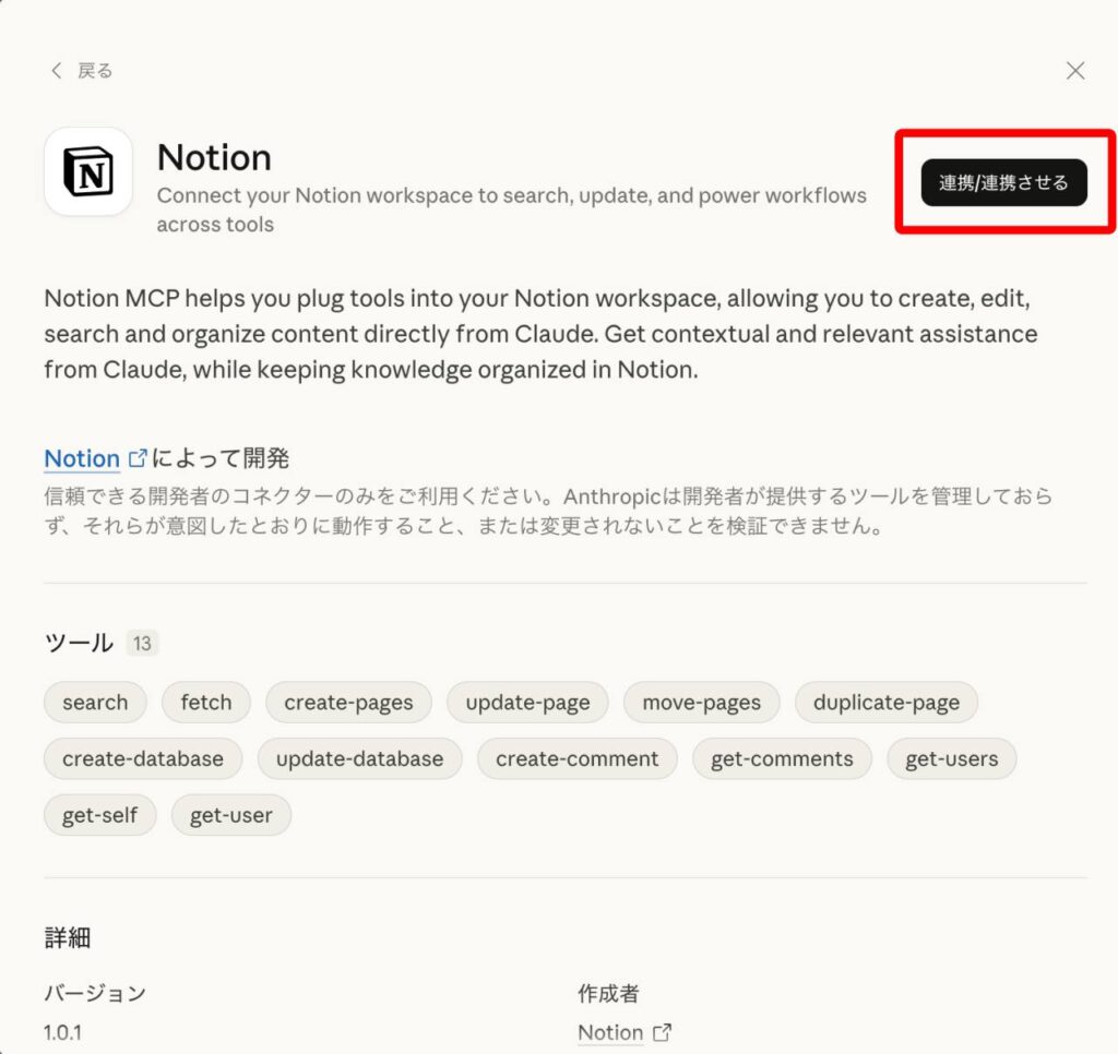 コネクタを選ぶと、そのサービスの詳細ページが表示されます。使えるツール(機能)の一覧、バージョン、開発者情報が確認できます。たとえばNotionコネクタでは、search・fetch・create-pages・update-page・move-pages・duplicate-pageなど13種類のツールが使えることがわかります。