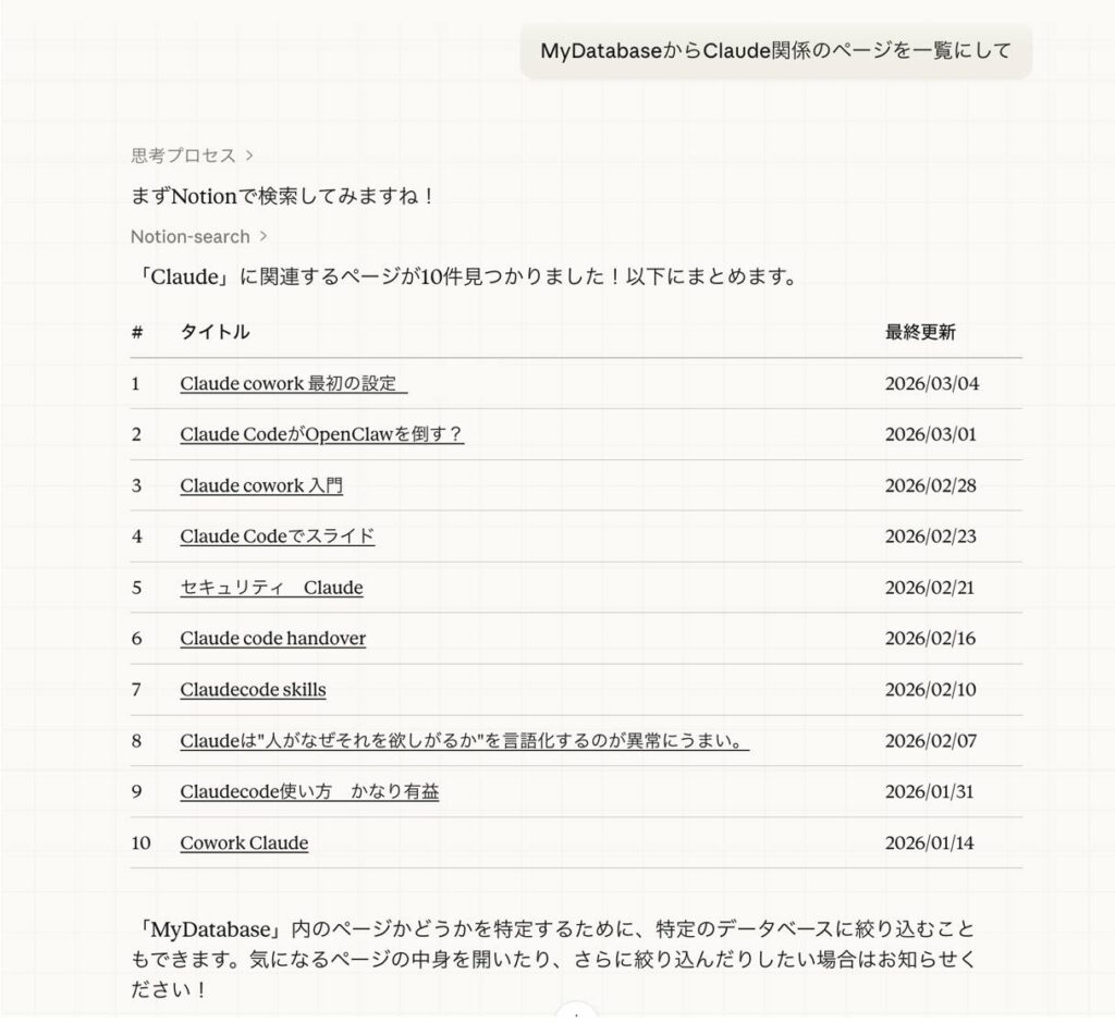 たとえば、すでにNotionの中に保存してある「MyDatabase」から以下のように「Claude関係のページの一覧にして」と入力すると、瞬時に表示してくれました。