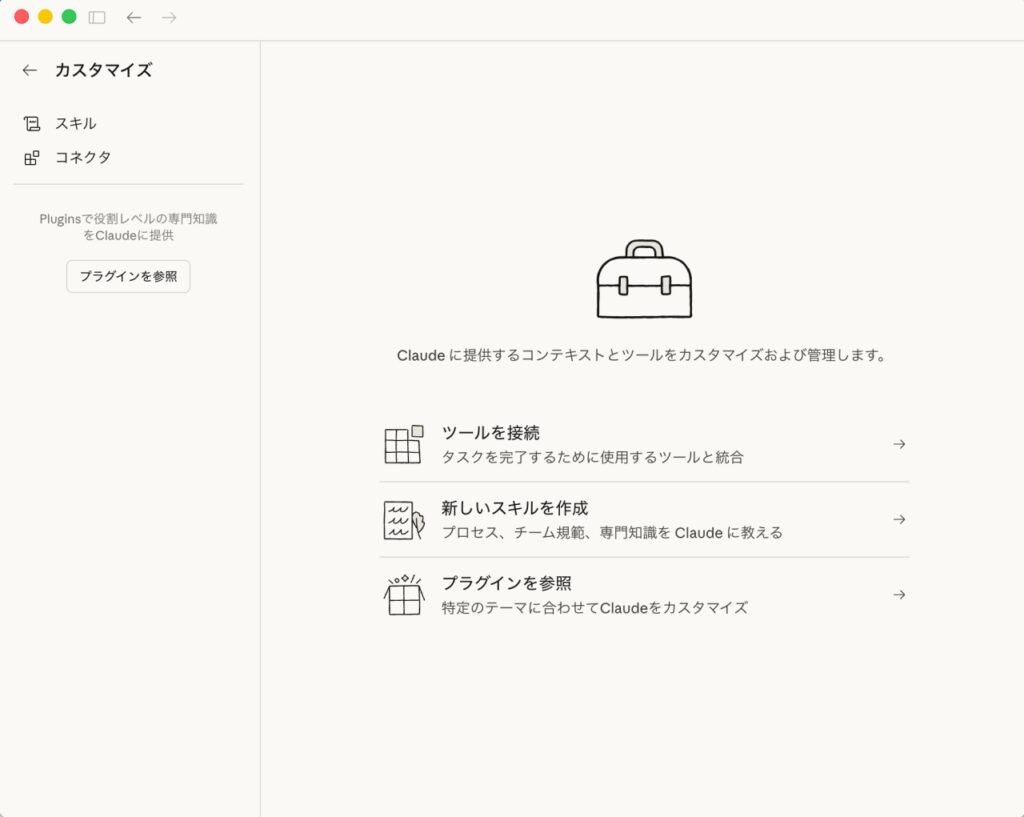 カスタマイズ画面に入ると、「ツールを接続」「新しいスキルを作成」「プラグインを参照」 の3つの選択肢が表示されます。