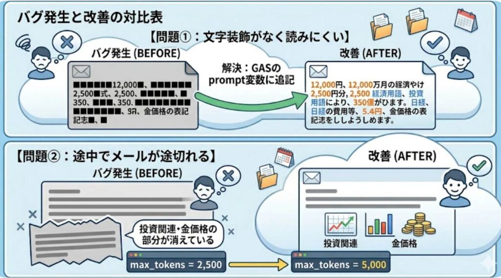 解決:APIが一度に出力できる文字数(max_tokens)の上限が低すぎたため、2,500から5,000に引き上げ。