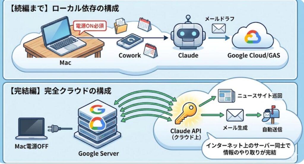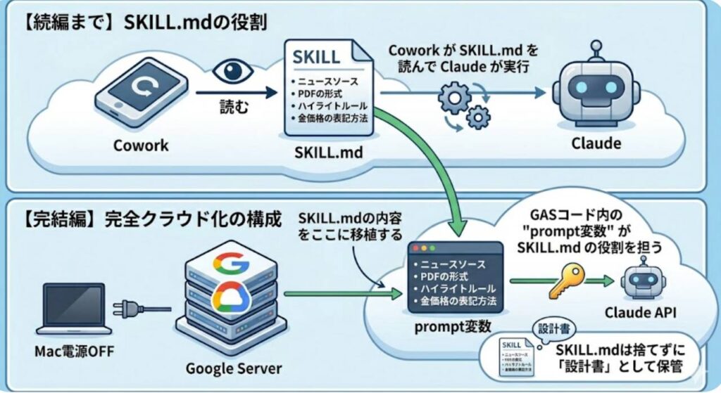 続編まではCoworkがSKILL.mdを読んで動いていました。しかし完全クラウド化ではGASがClaudeのAPIを直接叩くため、GASコード内の「prompt変数」がSKILL.mdの役割を担います。